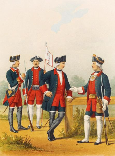 Сержант, фурьер, обер-офицеры пехотного полка, (1756–1761 гг.) Раскрашенная гравюра