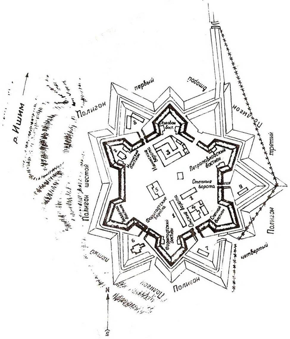 «Июнь 1752 года. Степь, ещё совсем недавно дремавшая, забурлила, закипела под тысячами ног, копыт лошадей. В урочище на берегу реки Ишим вошли драгуны Луцкого, Олонецкого и Вологодского полков, пешие воины Нотебургского полка. А так же эскадрон (имеется ввиду «сотня») казаков…» — написал как-то один блогер, из наших бывших земляков. — «Итак, мы видим как за одно лето возводится крепость. Не выключайте воображение, представьте себе на обрыве над рекой высящиеся бастионы. Равносторонний шестиугольник, крепостная стена длинной чуть меньше 1,5 км, ощетинившаяся пушками, бойницами. К крепости просто так не подойдешь: обрыв над рекой, между берегом и стеной 30 простых саженей(чуть меньше 50 метров) абсолютно пустого ровного пространства. С другой стороны бастионы смотрят на степь. Граница России защищена от набегов кочевников.»