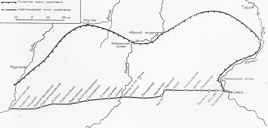 В итоге, к концу XVIII в. на Тоболо-Ишимской линии было построено всего 9 крепостей и только 16 редутов, которые располагались в следующем порядке и соединяли Оренбургскую линию с Иртышской: редут Песчаный, кр. Пресногорьковская, р. Пресногорьковский, кр. Кабанья, р. Пресноизбной, кр. Пресновская, р. Болотоколодезный, р. Саржанский, р. Дубравный, кр. Становая, р. Гагарий, р. Скопин, кр. Св. Петра, р. Плоский, кр. Полуденная, р. Медвежий, р. Чистый, кр. Лебяжья, р. Лосев, кр. Николаевская, р. Волчий, кр. Покровская, р. Курганский, р. Степной, р. Мельнишный.