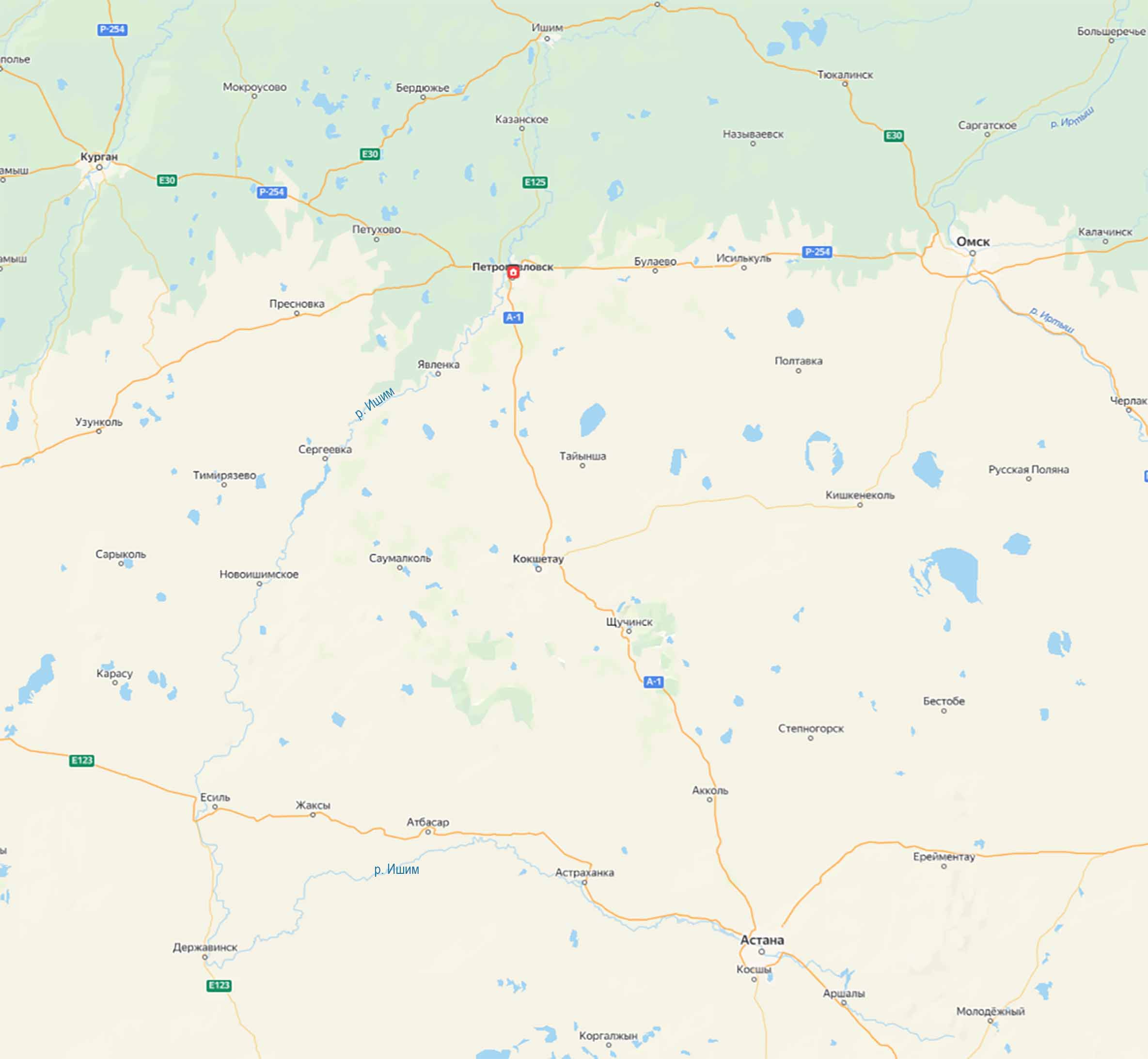 Через несколько километров река Ишим «попадает в плен» озерной страны. Происходит это там же, где расположен Петропавловск – аул основанный ханом Абалаем, сменивший много «прозвищ» с 1752-го года (с начала русской эпохи). Сначала это был просто участок Ишимской пограничной линии (форт Святого Петра). Затем (в конце века) он стал собственно Петропавловском (нельзя же было обидеть капризного и мнительного императора Павла). Здесь принимали послов из Кокандского ханства – предпоследнего препятствия на пути захвата всей Средней Азии. Наконец, с пришествием на казахскую землю Советов место окрестили «центром губернии» (а их сменилось 3). Сегодня это тоже центр. Но уже Северо-Казахстанской области. Вместе с пригородом Бесколь (там находится аэропорт) агломерация протяженна на 25 километров. Оборудованный участок набережной есть у останков крепости Святого Петра. Остальные красоты – шесть озер в городской черте (Пестрое – парк отдыха), бесконечные березовые рощи, зеленые жилые, гостевые и досуговые сектора, раскиданные по всем окрестным займищам. Изумрудное «сокровище» в заболоченной лесостепи имеет и центральную часть. Разумеется, недалеко от названной фортификации. Здесь стоит отметить Театральную площадь – конная статуя Абалая и Драматический театр (на месте которого в царские времена был собор, разрушен в 1936 г). Заметим, что туристы не проходят мимо мемориала 22 казненным большевикам (в свое время Северо-Казахстанская область вдруг оказалась в руках у казаков Волкова).